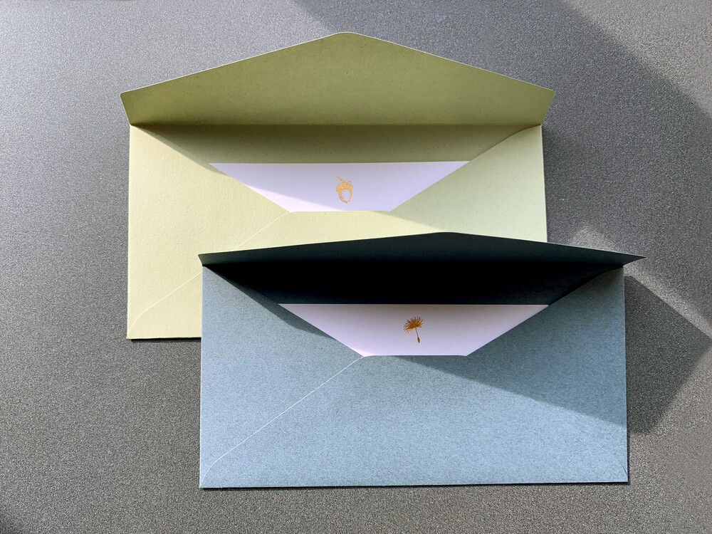 미니카드는 도토리 · 클로버 · 잎사귀 · 민들레씨 · 열쇠 5가지 그래픽을 핫 포일 스탬핑으로 제작하였습니다.